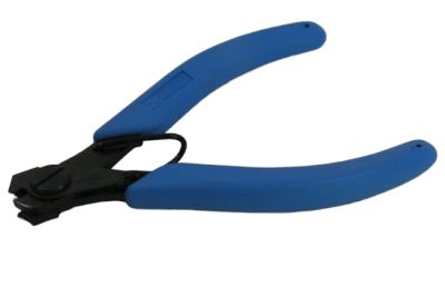 This style of wire cutter has an adjustable clamping fixture which holds the material being cut perpendicular to the cutter jaws.